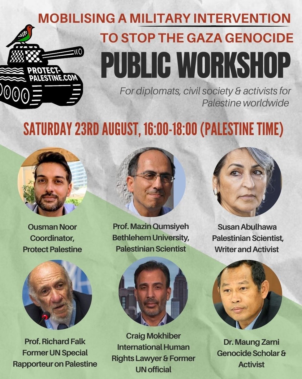 International demand for a military intervention to stop Israel’s genocide of Palestinians in surging. Join diplomats, civil society and Palestine activists from around the world for this groundbreaking workshop to mobilise a military force to break the siege and stop the genocide.