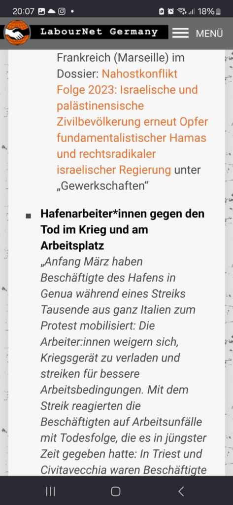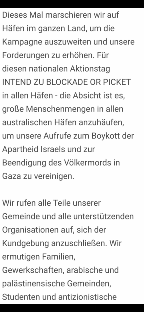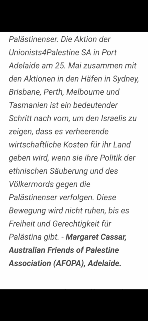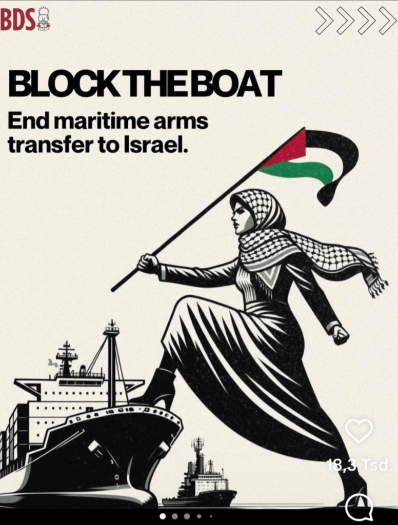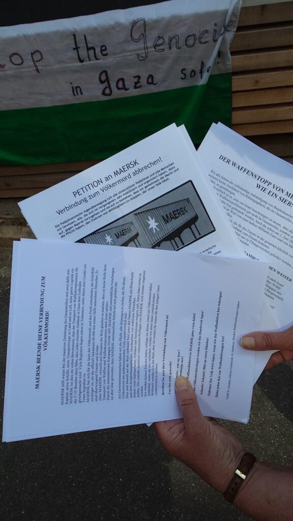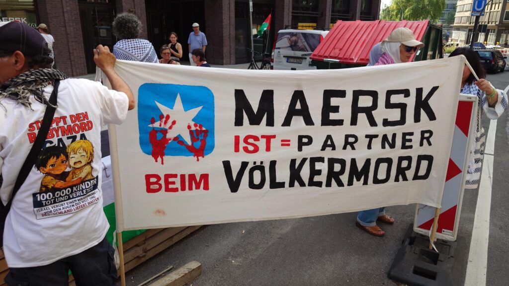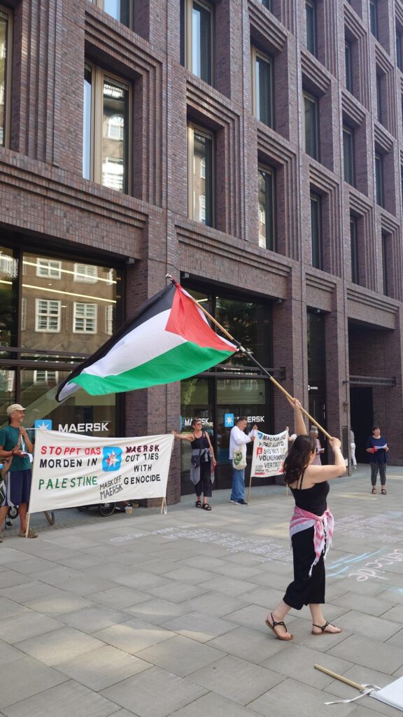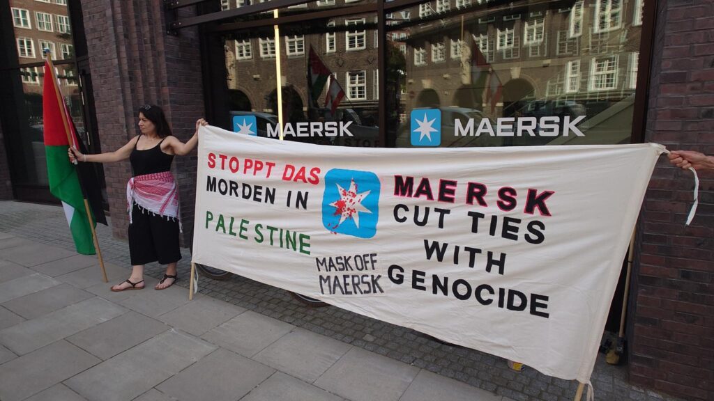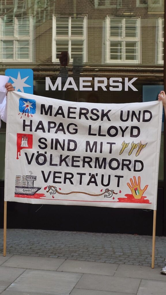 Der Logistikriese MAERSK, dessen Schiffe fast täglich im Hamburger Hafen anlegen, unterhält eine Niederlassung in Hamburg, die seit Wochen jeden Donnerstag aus Solidarität mit Palästina von Aktivisten belagert wird, sodass diese Niederlassung sich gezwungen sieht, seine Mitarbeiter ins Homeoffice zu schicken, damit sie nicht mit der Beihilfe zum Völkermord ihres Arbeitgebers für Stunden konfrontiert werden. Auch die Eingänge bleiben dann für Stunden für alle Geschäftskunden und Boten geschlossen. Es ist den Angestellten unter Androhung von Kündigung verboten mit den Aktivisten zu sprechen.
