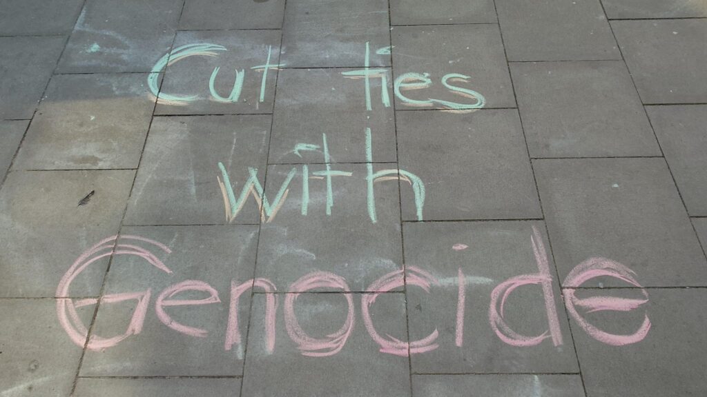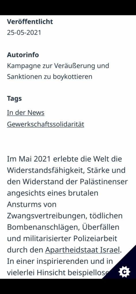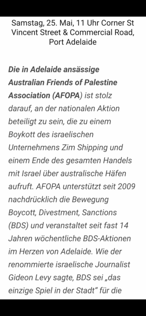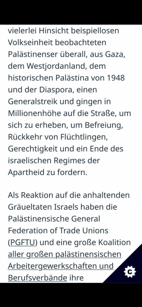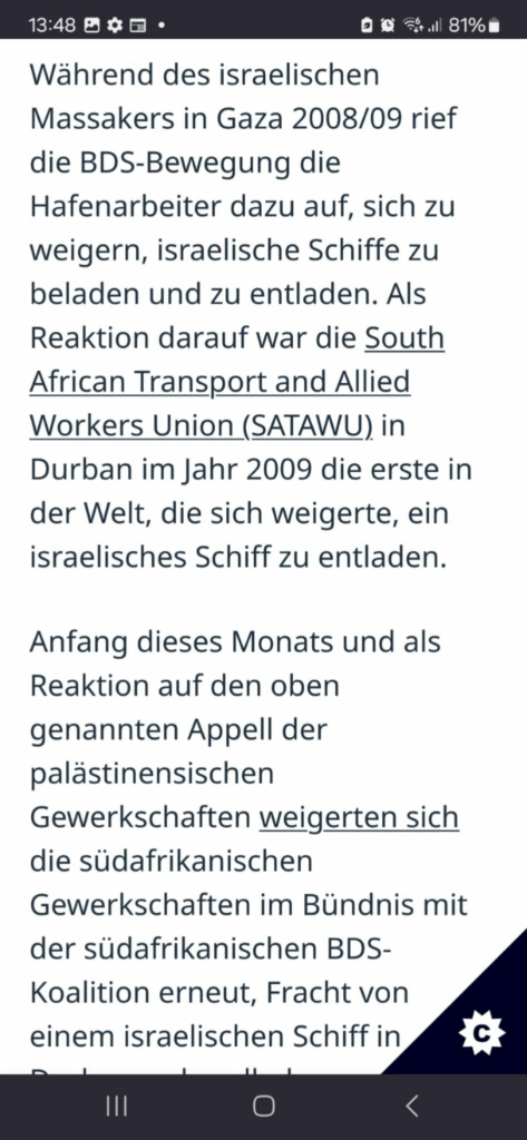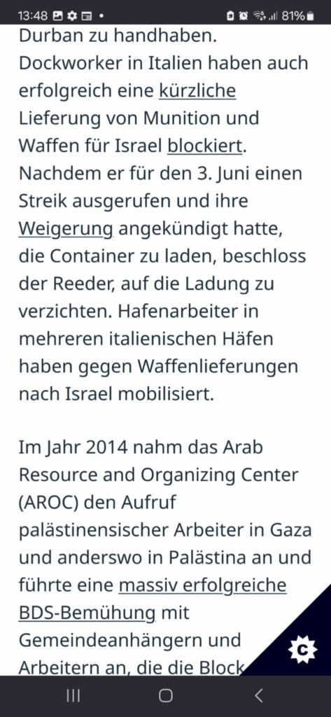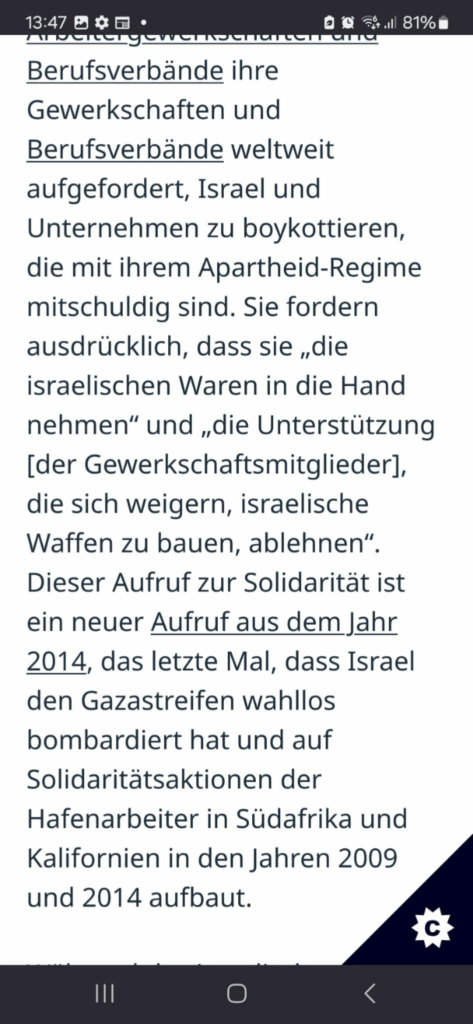 Wir sind also nicht machtlos zum zuschauen verbannt, weil alle Apelle an die Regierung und die Gewerkschaften ignuriert werden, der Ökonomie des Völkermords die Gelder und Arbeitskraft zu entziehen.