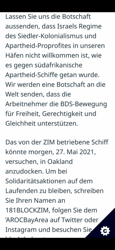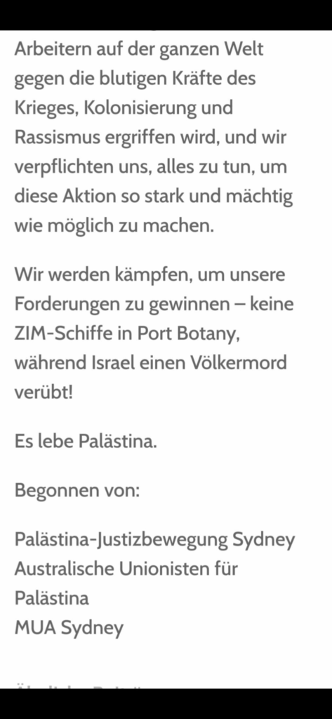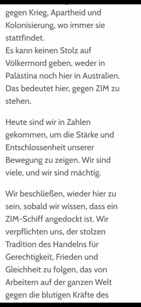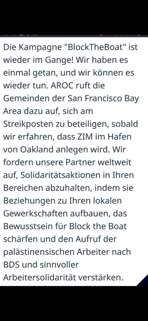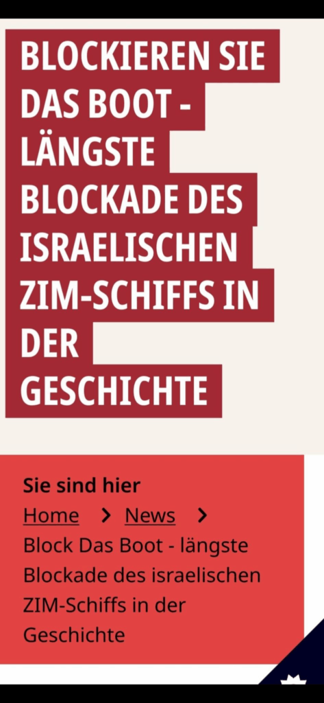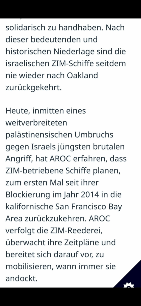Ein neues Widerstandsprojekt, das auch in die fortschrittlichen Ebenen der Gewerkschaften vermittelt werden muss, nimmt wie auch gegen MAERSK Gestalt an. Es geht um die israelische Reederei ZIM, die die Terminals im Hamburger Hafen intensiv nutzt und sich ebenfalls mit Büros in Hamburg gefindet.