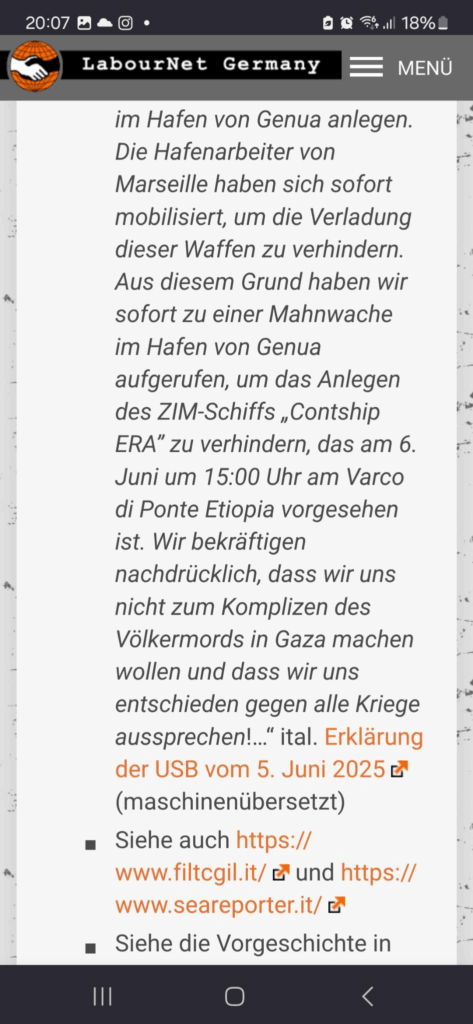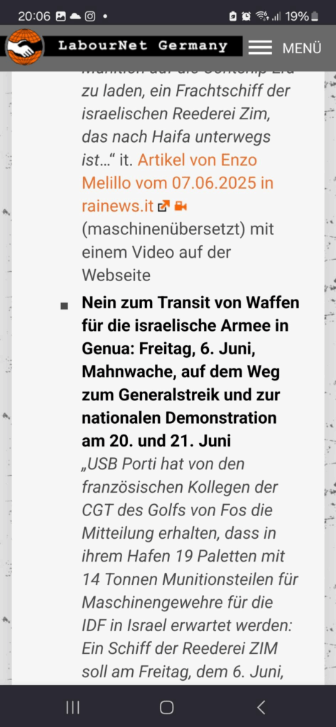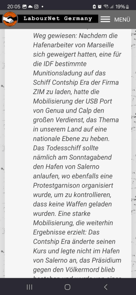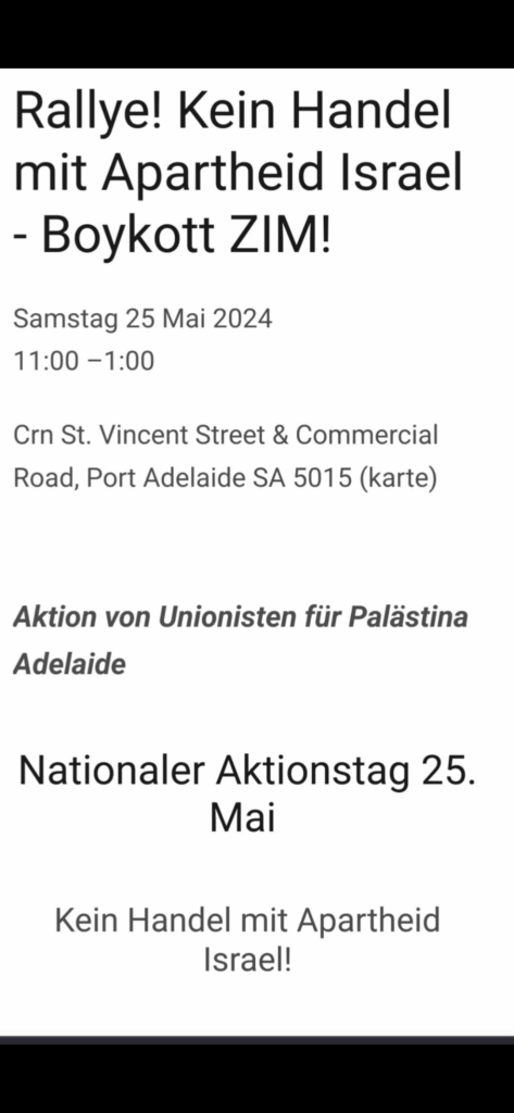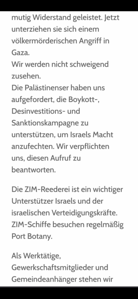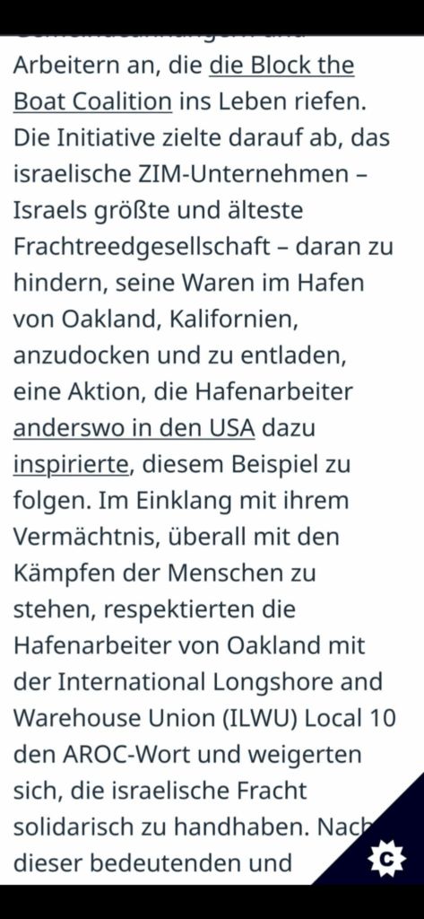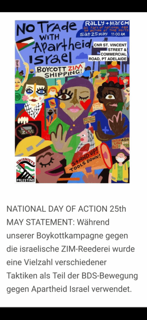 Ein neues Widerstandsprojekt, das auch in die fortschrittlichen Ebenen der Gewerkschaften vermittelt werden muss, nimmt wie auch gegen MAERSK Gestalt an. Es geht um die israelische Reederei ZIM, die die Terminals im Hamburger Hafen intensiv nutzt und sich ebenfalls mit Büros in Hamburg gefindet.